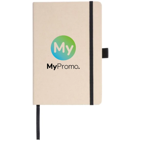 Sugarcane notebook (approx. A5) with 80 lined pages (80 gsm) made from sugarcane. With an elastic band, pen loop, and ribbon marker. Embossed sugarcane logo on the backside.