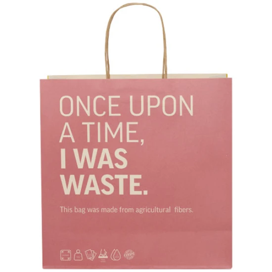 Extra large 150 g/m2 paper bag (31 x 12 x 31 cm) made from agricultural waste with twisted paper handles. The customisable front and back provide ample space for printing a logo, or any other design, making it an excellent business marketing tool. Made in Europe and 100% recyclable, making this bag a more sustainable choice for environmentally-conscious businesses and individuals looking for an sustainable packaging solution. Agricultural waste, 150 g/m2.