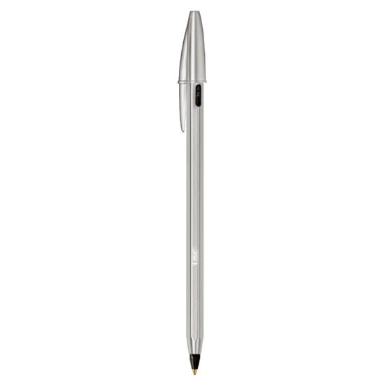 A premium and refillable BIC® Cristal Re'New ball pen with blue or black ink and 2 refills included to keep you writing for a very long time. The pen features a durable matte silver metal barrel and a matching 96% recycled plastic cap. Same ingenious hexagonal shape as the original BIC® Cristal for controlled grip and comfort. Sustainable design, trusted quality, and timeless value. The product comes with BIC® window box packaging.