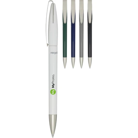 Ballpoint pen with the barrel and clip made of recycled plastic, and the tip made of stainless steel. Ink colour: Blue. Writing length: 3000 metres. Nib size: 1.00 mm. Made in Germany. Recycled Plastic.
