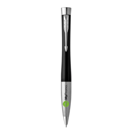 Parker ball pen Urban Twist. Made in metal with chrome-plated fittings and the brand's iconic arrowhead clip. Twist mechanism and blue ink, with stylish sandglass curves for an eye-catching, modern look. Presented in an individual black case with Parker logo. With Parker QuinkFlow ink, for a smooth and reliable writing on paper.