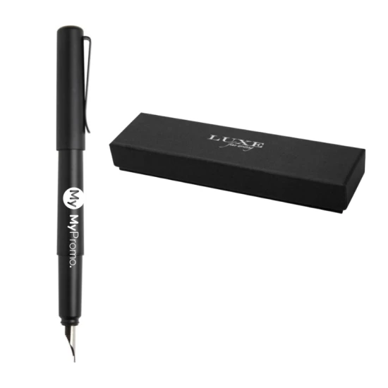 Fountain pen with a recycled aluminium barrel with mattee black coating and a black recycled aluminium grip. Aluminium is a recyclable material and by choosing this pen, you can support more sustainable practises and give new life to discarded aluminium materials. This stylish fountain pen serves as a practical and more sustainable option for individuals and organisations looking for environmentally friendly writing instruments. Delivered with a black cartridge and a black gift box. Box size: 16.8 x 4.2 x 2.5 cm. Recycled Aluminium.