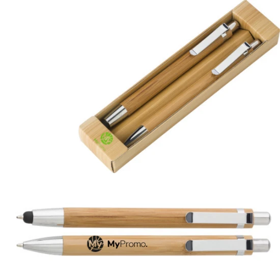 This multifunctional, sustainable pen set is made from bamboo and metal which ensures high quality. The pen has a rubber tip for capacitive screens and a mechanical pencil. It is offered with a cardboard box. This product can be personalised with a logo. Uses blue ink.