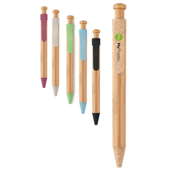 Push button ball pen with bamboo barrel and wheat straw (50%) and ABS (50% ) fittings. Blue ink. Bamboo is a natural product, there may be slight variations in colour and size per item, which can affect the final decoration outcome.