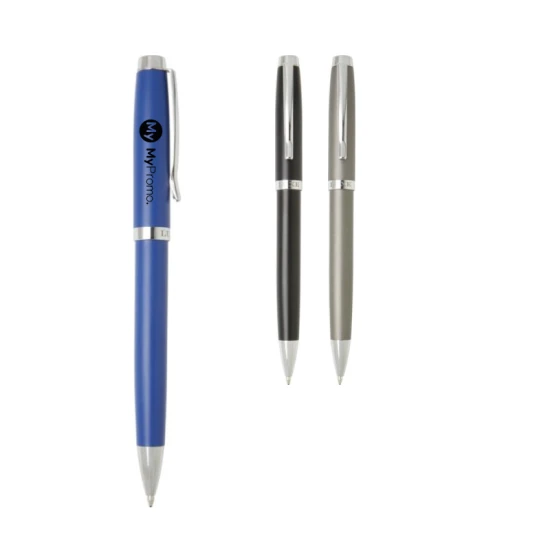 Sleek ballpoint pen with exclusive design available in three executive colours. Pre-loaded with a black ink refill and packed in a LUXE gift box. Brass.