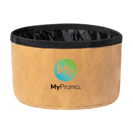 Foldable dog bowl in laminated recycled paper and RPET polyester.