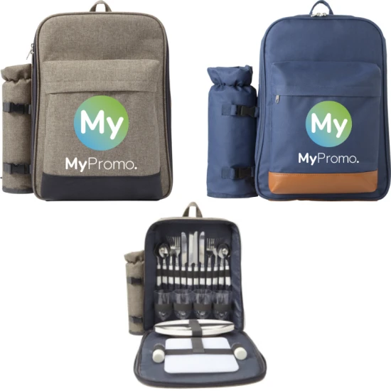 Polyester (600D) picnic rucksack with plastic cutlery for four people and a large cooling compartment. With an extra bottle holder and a set of salt and pepper shakers.