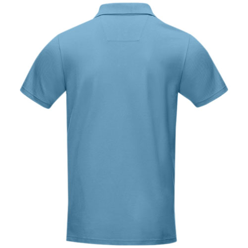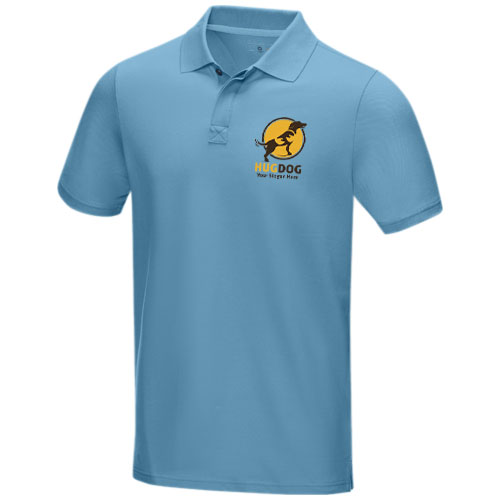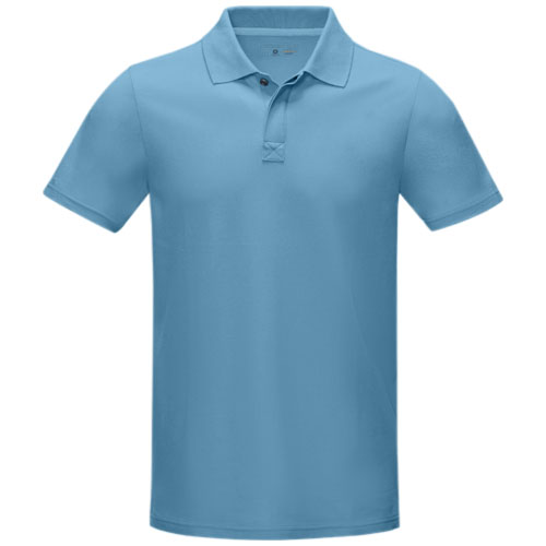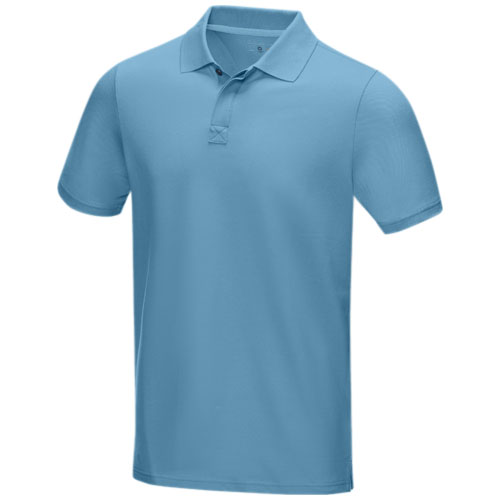 Sustainable promotional apparel. Sustainable metal buttons. Hidden three button placket. Flat knit collar. Bi-coloured branded necktape. Side slits with bi-coloured branded tape finishing. Half moon. Heat transfer main label for tagless comfort. Piqué knit of 100% GOTS certified organic cotton, 180 g/m2.