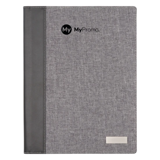 A4 sized document folder with Linen and PU leather covers. Includes a 20 lined sheet notepad and a metal plate.