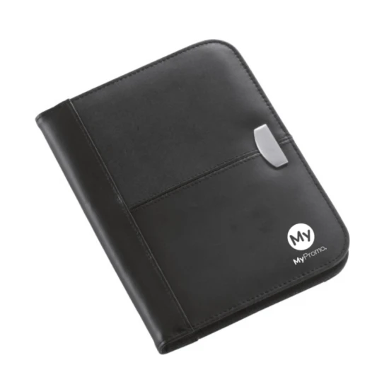 Bonded leather conference folder (approx. A5) with a zipper. Includes a notepad with 25 pages, various pockets, and an elasticated pen loop (pen not included).