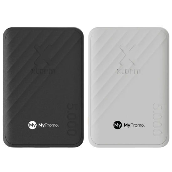 Small and compact 5000 mAh power bank, providing at least one full charge for a smartphone or earbuds. The power bank has 2 USB ports and charges extra fast thanks to the 12W FastCharge technology from Xtorm. Recycled ABS Plastic.