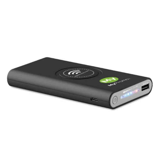 Wireless charging power bank with 8000 mAh capacity. Power bank can be charge by cable or wireless charging. Includes Type C connector. Powerbank output DC5V/2.1A. Wireless output: DC5V/1A. Wireless receiving: DC5V/0.75A Compatible latest androids, iPhone® 8, X and newer.