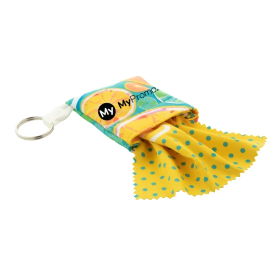 Custom made, microfibre (180 g/m²) cleaning cloth for glasses in polyester pouch with velcro closure and key ring. With all over sublimation printed graphics. MOQ: 100 pcs.