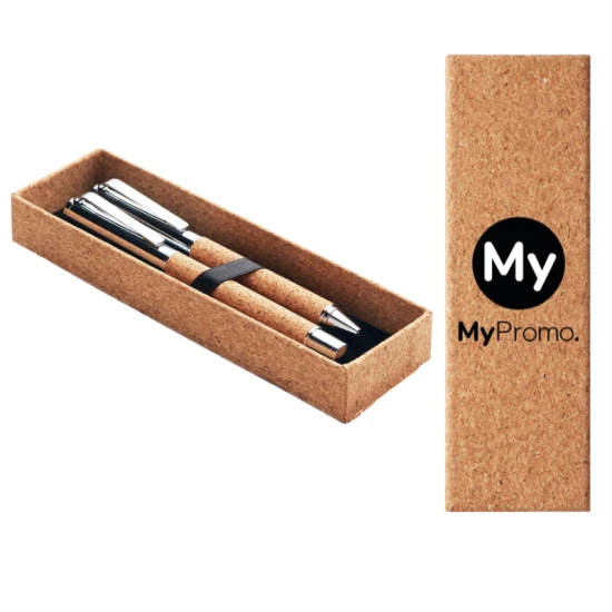 Metal pen set with ball pen (twist mechanism) and roller ball (open cap) with cork barrel. Presented in matching cork box. Blue and black ink respectively. Cork is a natural material, due to its structural nature and surface porosity the final print result per item may have deviations.