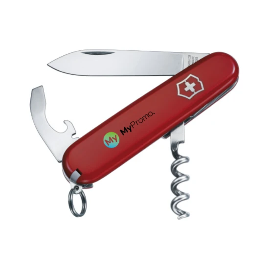 Victorinox pocket knife with nine functions: a large blade, corkscrew, key ring, bottle and can opener, screwdriver with wirestripper, tweezers and toothpick. Scratch resistent. Individually packaged in giftbox.