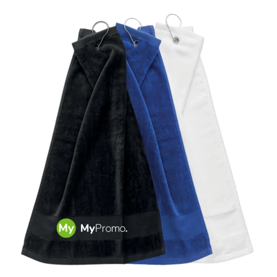 Cotton golf towel with a copper hole and ring on top that can be used as a hanger. 350 gr/m². Towel size: 40x60 cm.