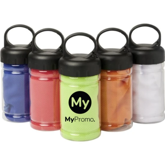 Quick absorbing, quick drying, and washable cooling towel made of strong and durable polyester for keeping cool during work-out or any outdoor activity. Comes in a PET container with a carry handle with a built-in carabiner for easy carrying. Available in 5 fresh colours. Large decoration logo area on the container, decoration also possible on the cooling towel itself. Size: 30 x 80 cm. PET Plastic.