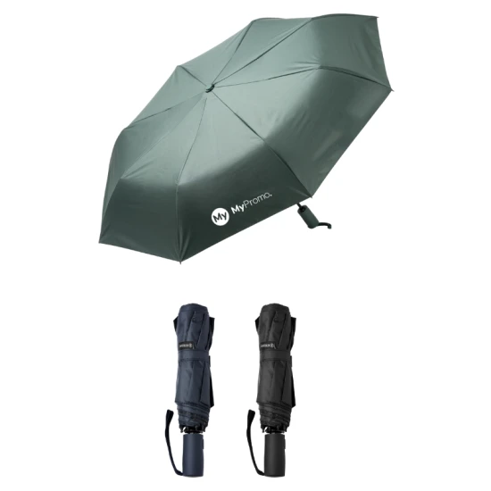 Folding umbrella made of RPET with UV protection. Automatic opening and closing. Pongee 190T fabric with UV protection SPF50. Fiberglass ribs with windproof system. Plastic handle with rubber finish. Velcro closure. Supplied with coordinated colored pouch.