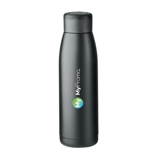 Double wall recycled stainless steel (90% recycled stainless steel and 10% stainless steel) bottle with soft silicone carry ring lid. By simply shaking the bottle surface temperature changes to heating or cooling, depends on liquid inside. Leak-free. Capacity: 400 ml.