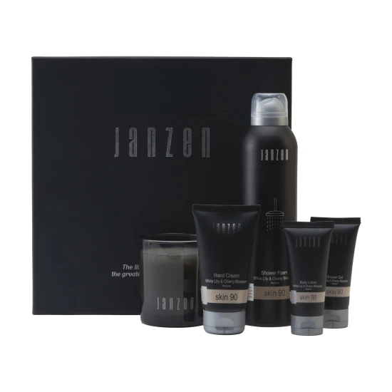 A gift set containing 5 products in the Skin 90 fragrance by Janzen. Contents: Shower foam - 200 ml, scented candle - 120 g, hand cream - 75 ml, body lotion - 40 ml, shower gel - 40 ml. Five wonderful home and body products that provide ultimate moments of happiness and relaxation. Cheerful and happy, that is Skin 90. In this perfume, the subtlety of the cherry blossom is interspersed with the freshness of the lily and the power of the tonka bean. The fine products are packaged in a luxurious gift box.