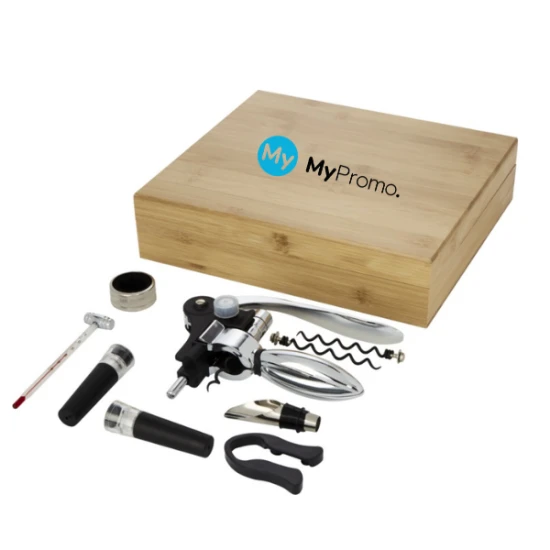 9-piece wine set including 1 corkscrew, 2 stoppers, 1 pourer, 1 ring, 1 foil cutter, 1 thermometre, and 2 spare corkscrews. Delivered in a bamboo gift box sourced and produced following sustainable standards. Stainless Steel, Bamboo wood.