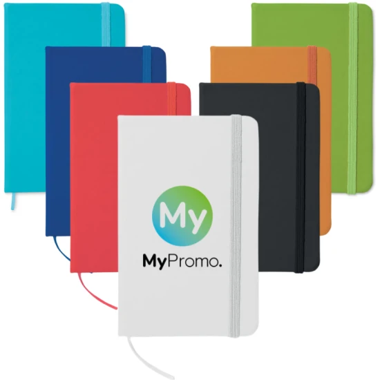 A5 notebook with hard PU cover. Casebound. 192 lined pages (96 sheets). Matching elastic closure strap and ribbon page-marker.